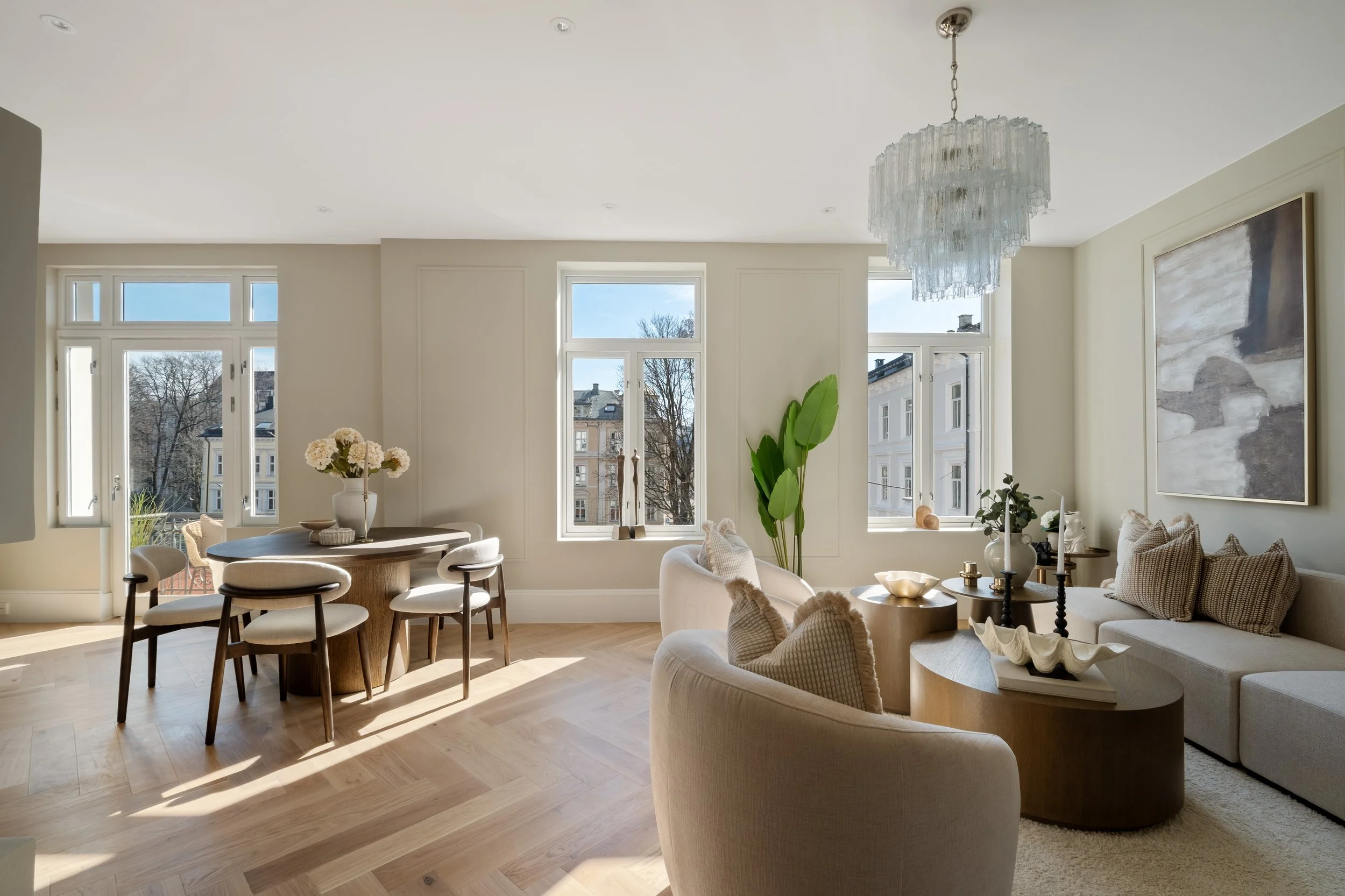 Med full styling forvandler vi en tom bolig til et hjem kjøperne drømmer om. Vi innreder hele boligen med nøye utvalgte møbler, tekstiler og dekor som skaper et helhetlig, moderne og innbydende uttrykk.